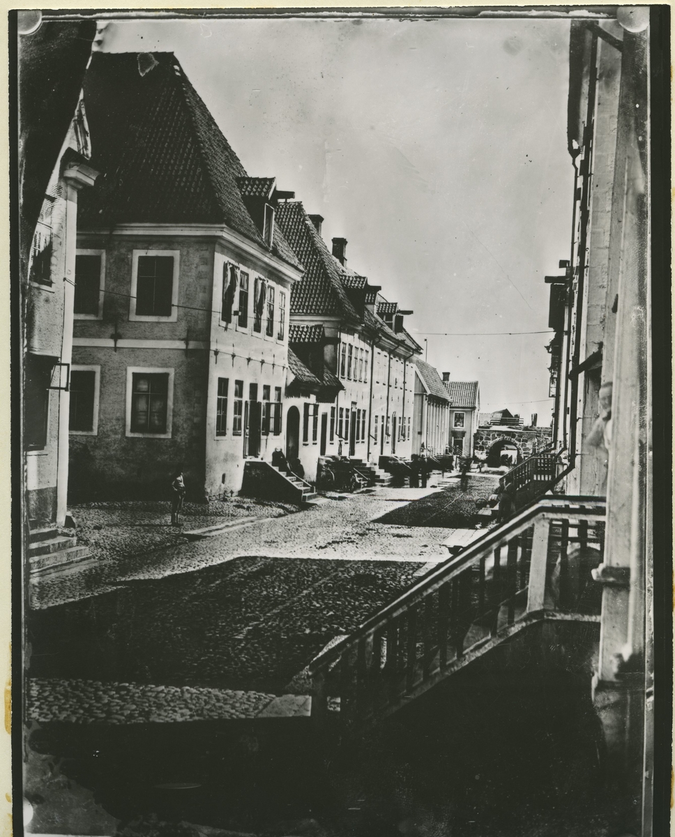 En av de äldsta kalmarbilderna visar Kaggensgatan mot Jordbrovalvet. Observera fritrapporna. Jordbrovalvet täcktes ännu av 1600-talsmuren.