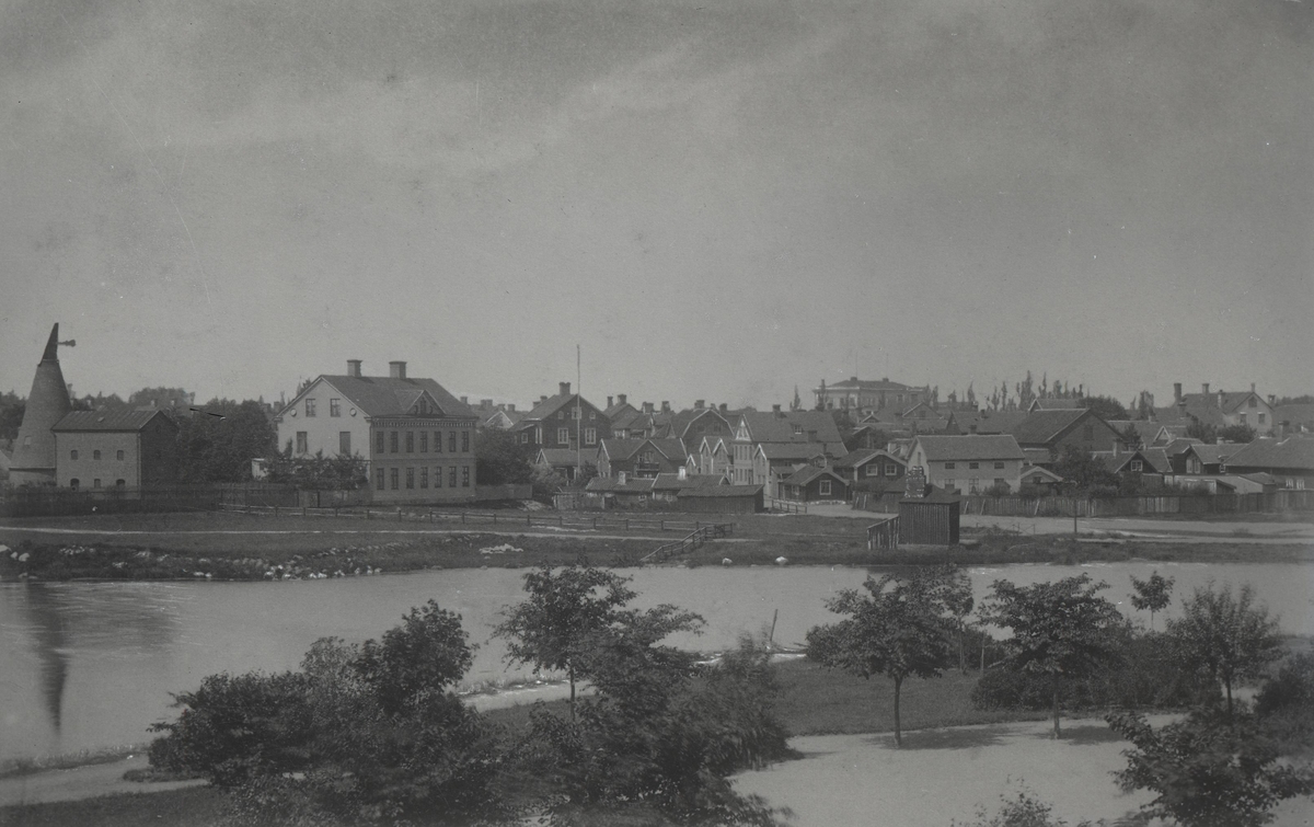 Nuvarande Sveaplan från vallen vid Vattentornet. Norrgård reser sig över de andra byggnaderna till höger. Till vänster i bild syns en torkria för malt.