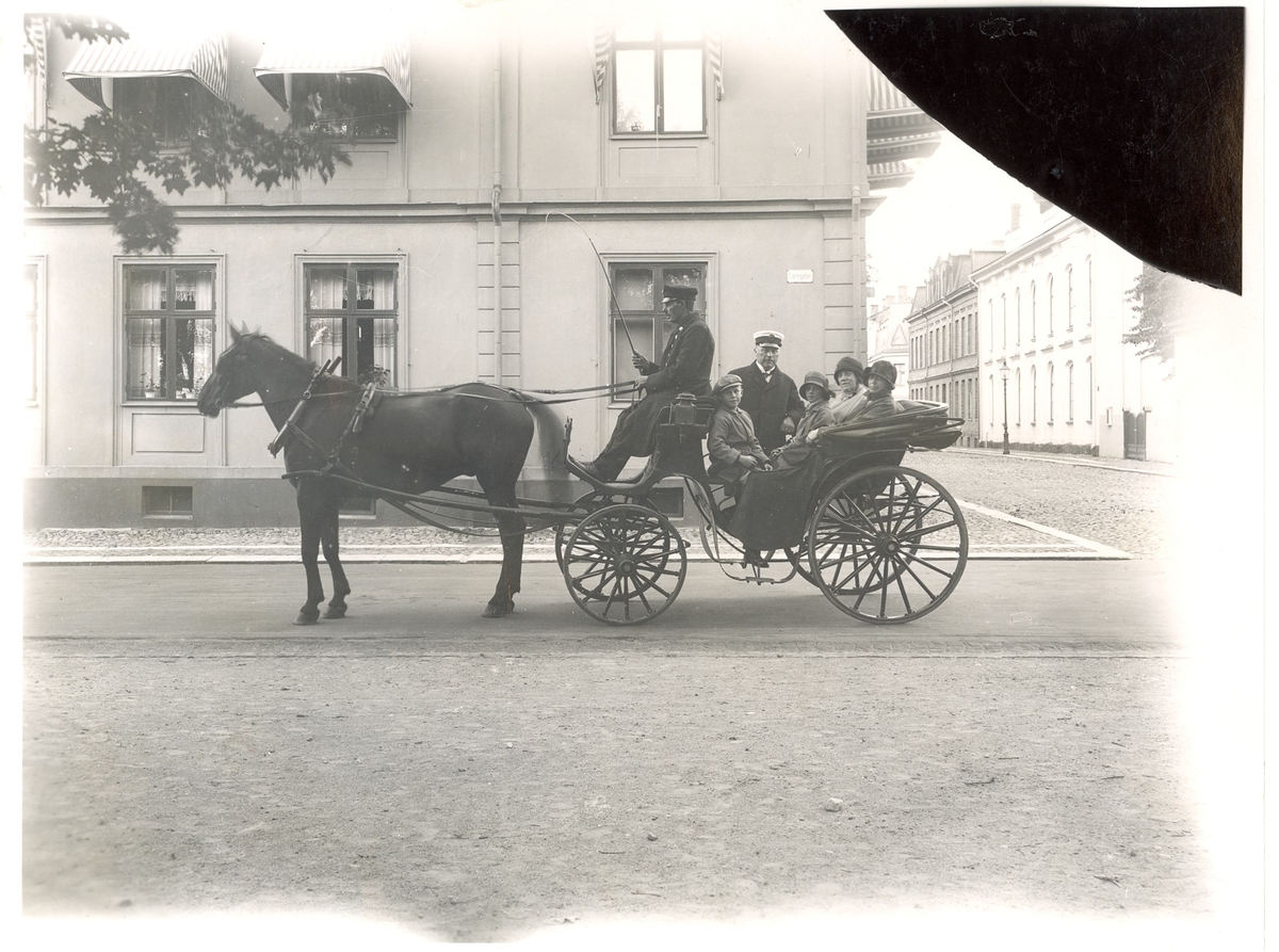 Fem personer i en hästdroska, på Larmgatan. Kusken heter Palmqvist.