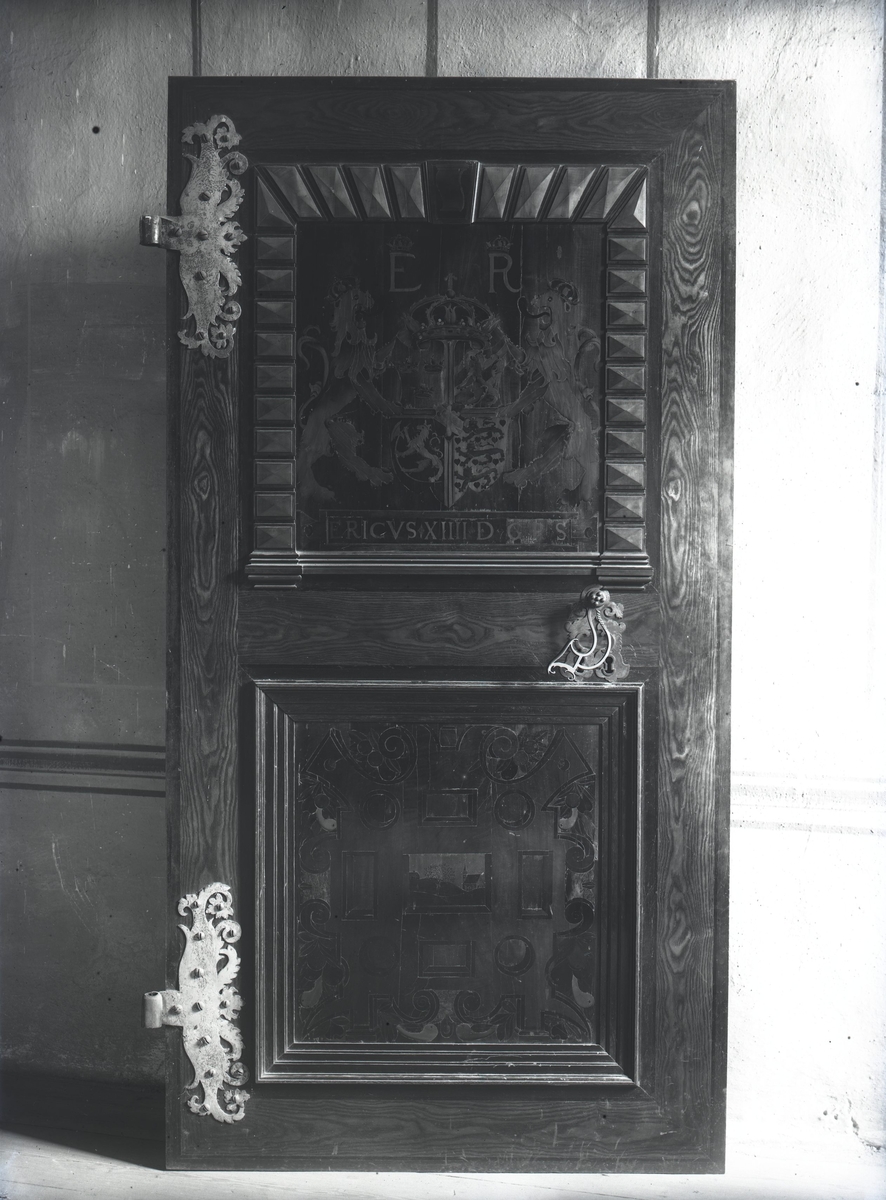 Dörr med intarsia i dörrspeglarna. Erik den XIV:s gemak på Kalmar slott.