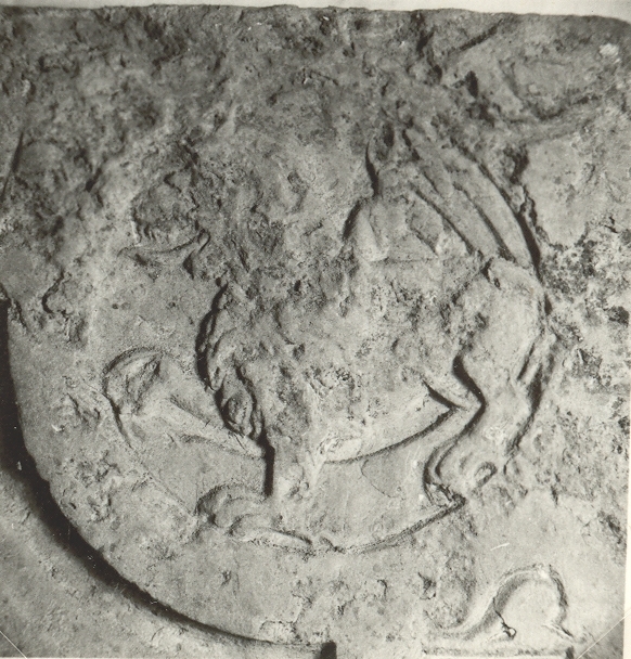 Detalj av gravhäll i Loftahammars kyrka med Årtalet "A.N D.M 1670 inhugget.