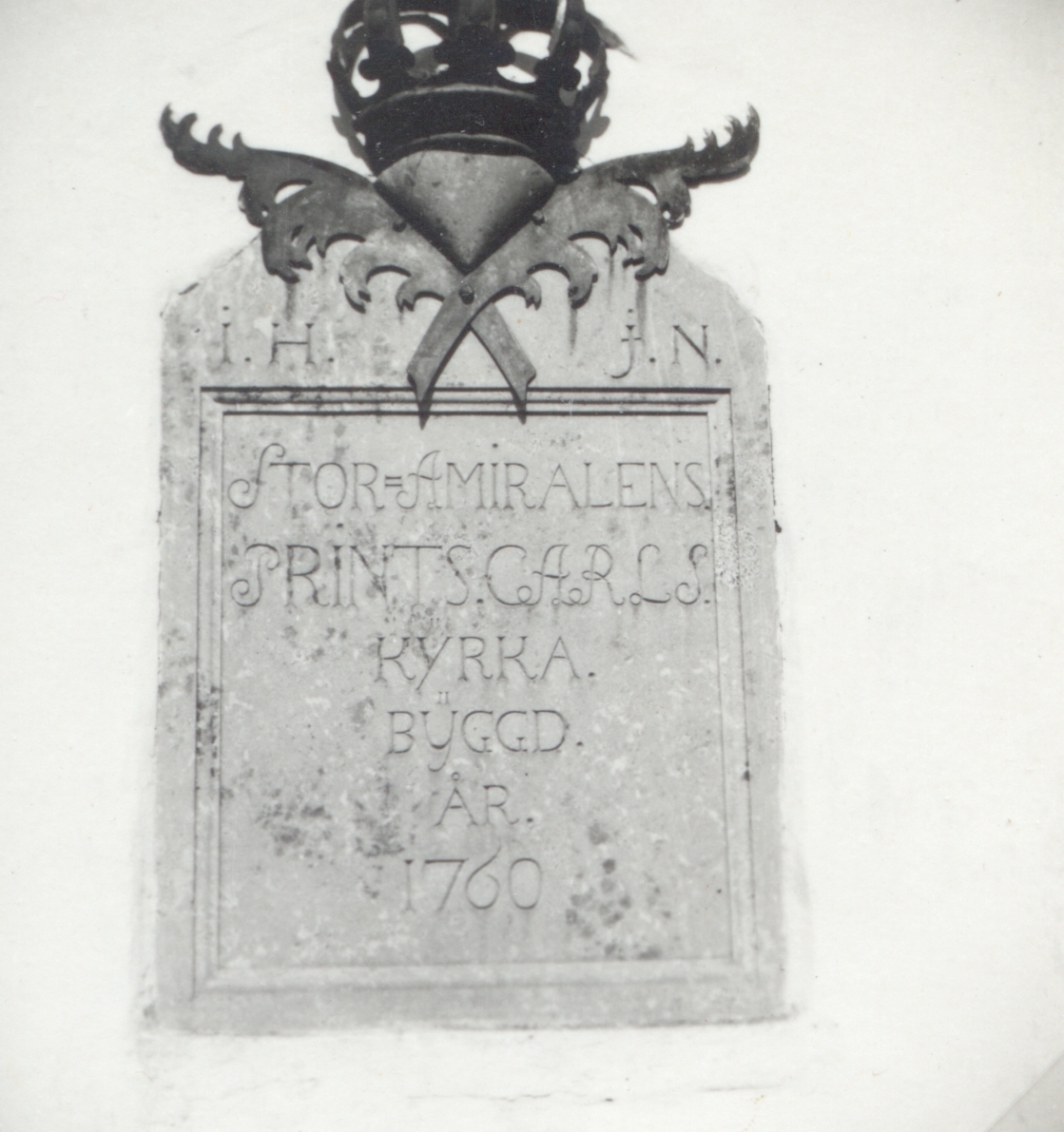 Minnestavla på Loftahammars kyrka :"Stor-amiralen prints Carl kyrka byggd år 1760"
