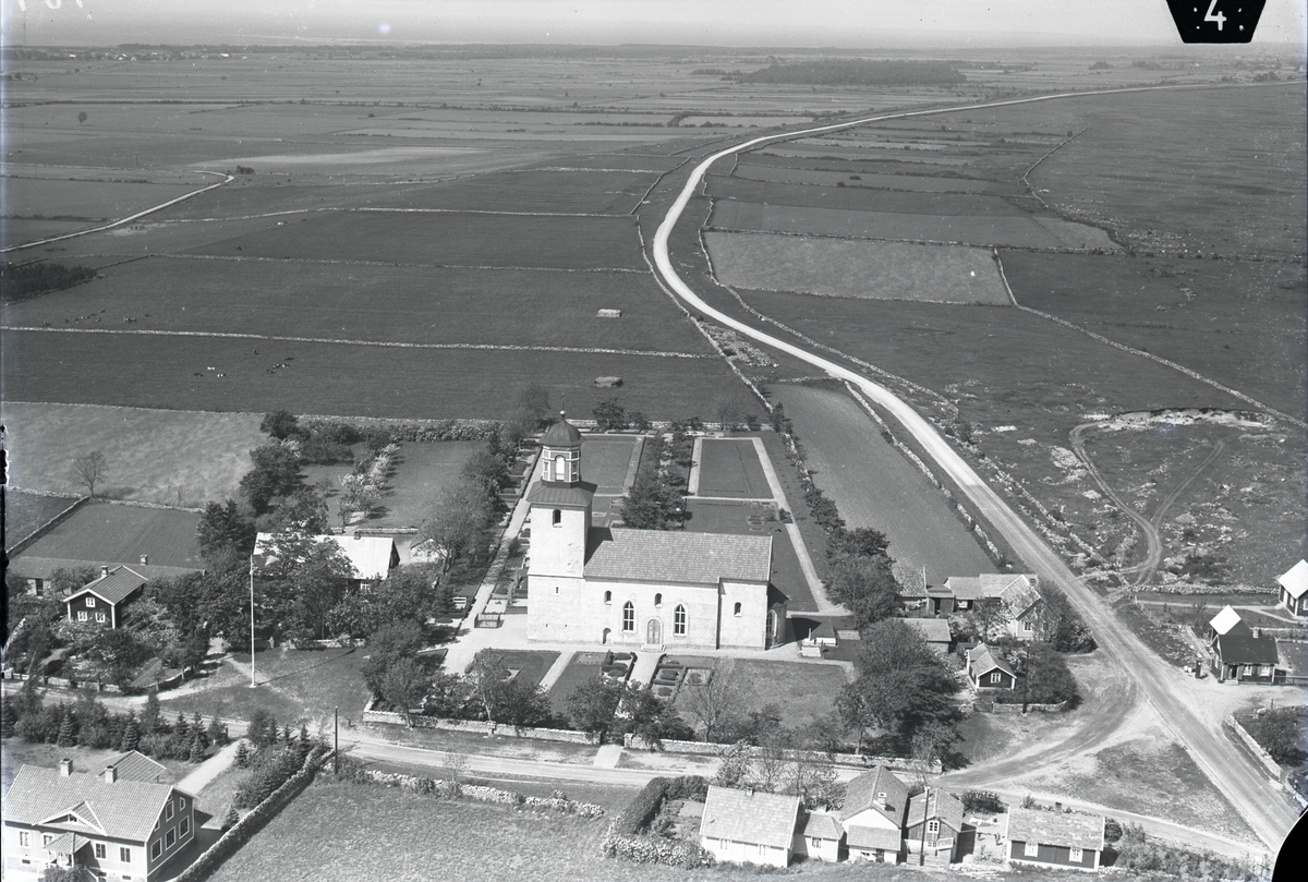 Flygfoto över Resmo på Öland. Kyrkan och kyrkogården i Resmo.