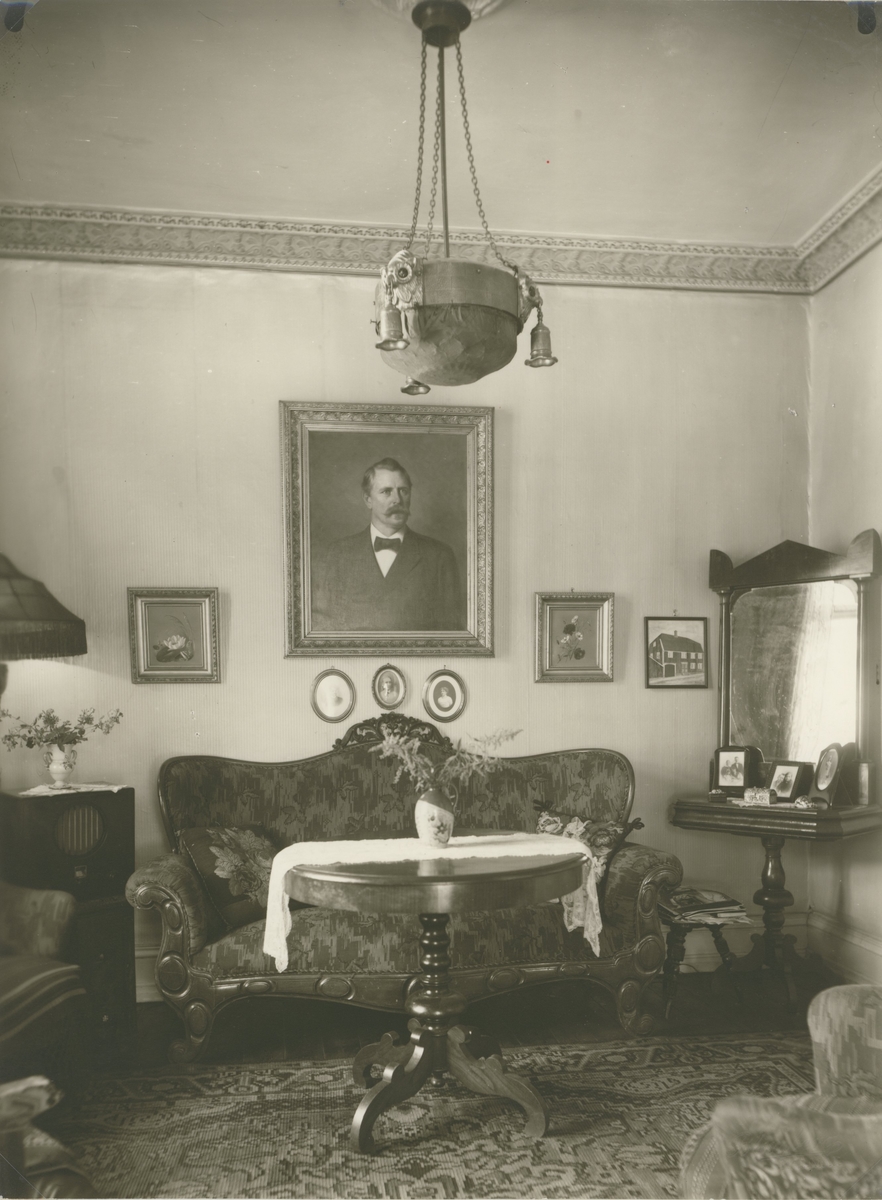 Porträttet ovanför soffan föreställer kakelfabrikören Sandbäck. Tavlan till höger Norra Vägen ovanför Dunges.