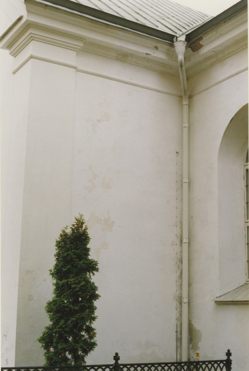 Dalhems kyrka, putsad fasad med valvfönster. Foto från renoveringen 1993.