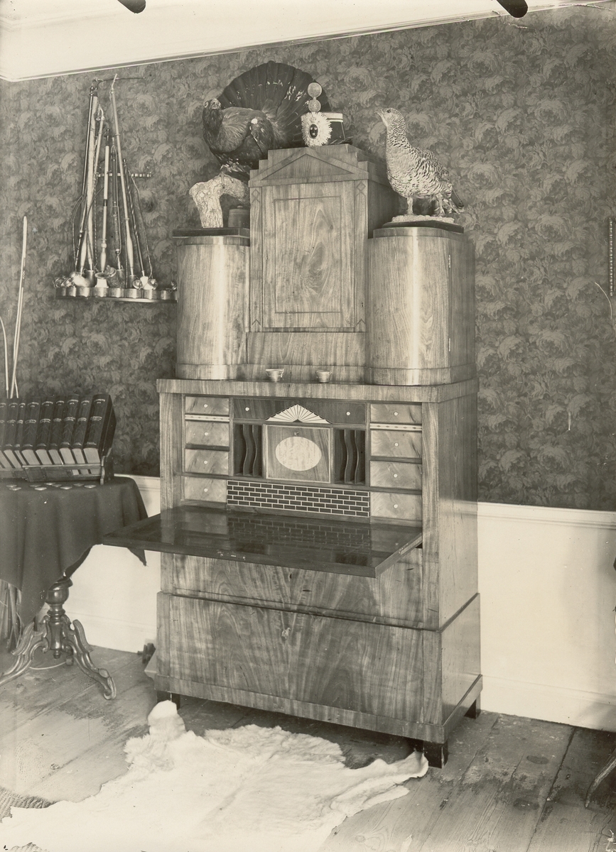 Skrivskåp av mahogny med inlagda fält och ränder i baronens skrivrum. Har tillhört ägarens farfar.