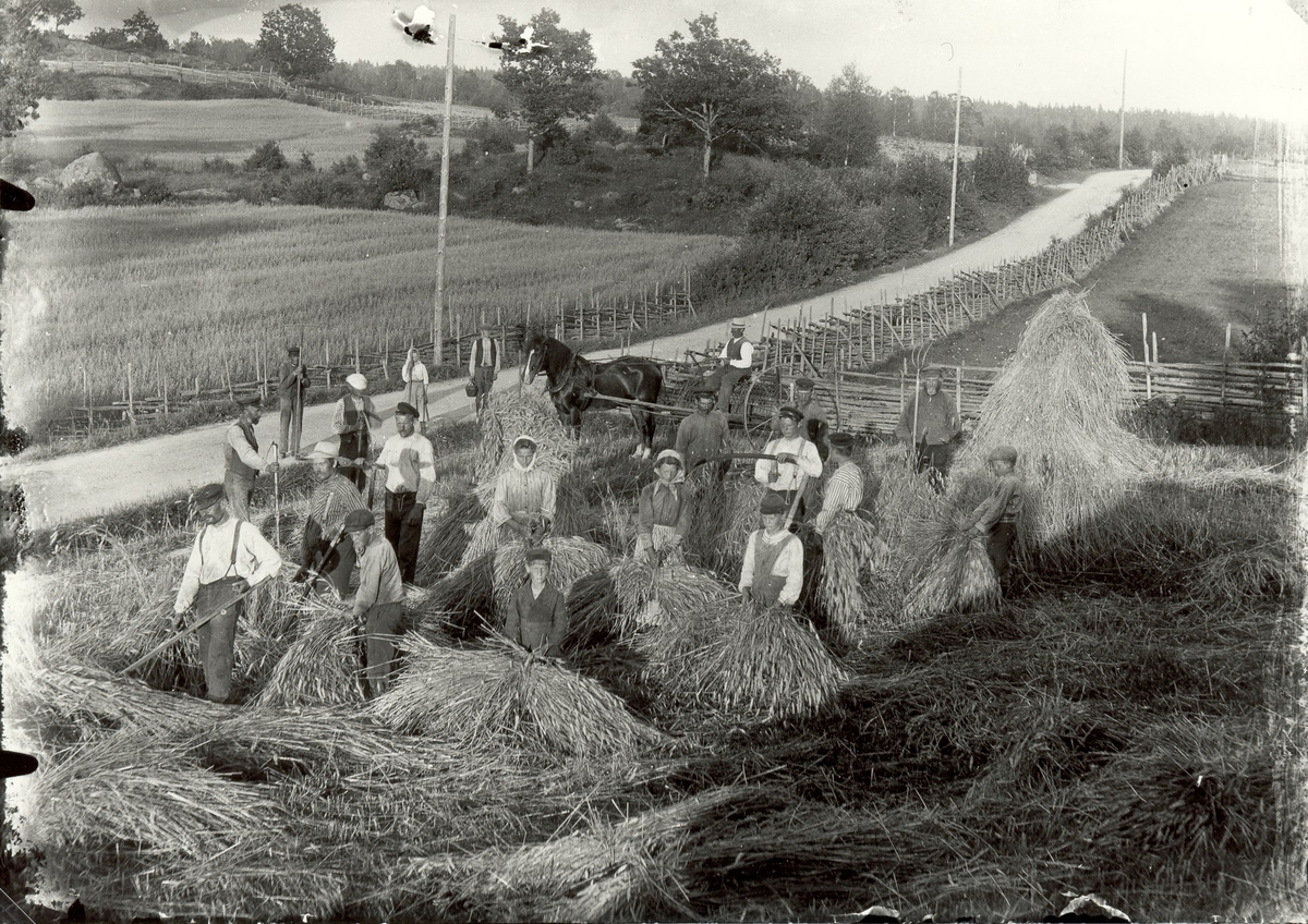Dagsverkare i Hjorted i arbete med rågskörden.
