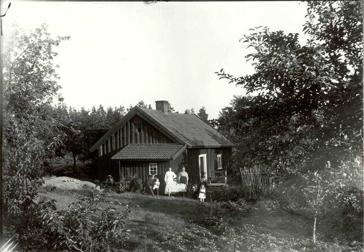 En familj dricke kaffe utanför sin stuga i Mossebo 1921.