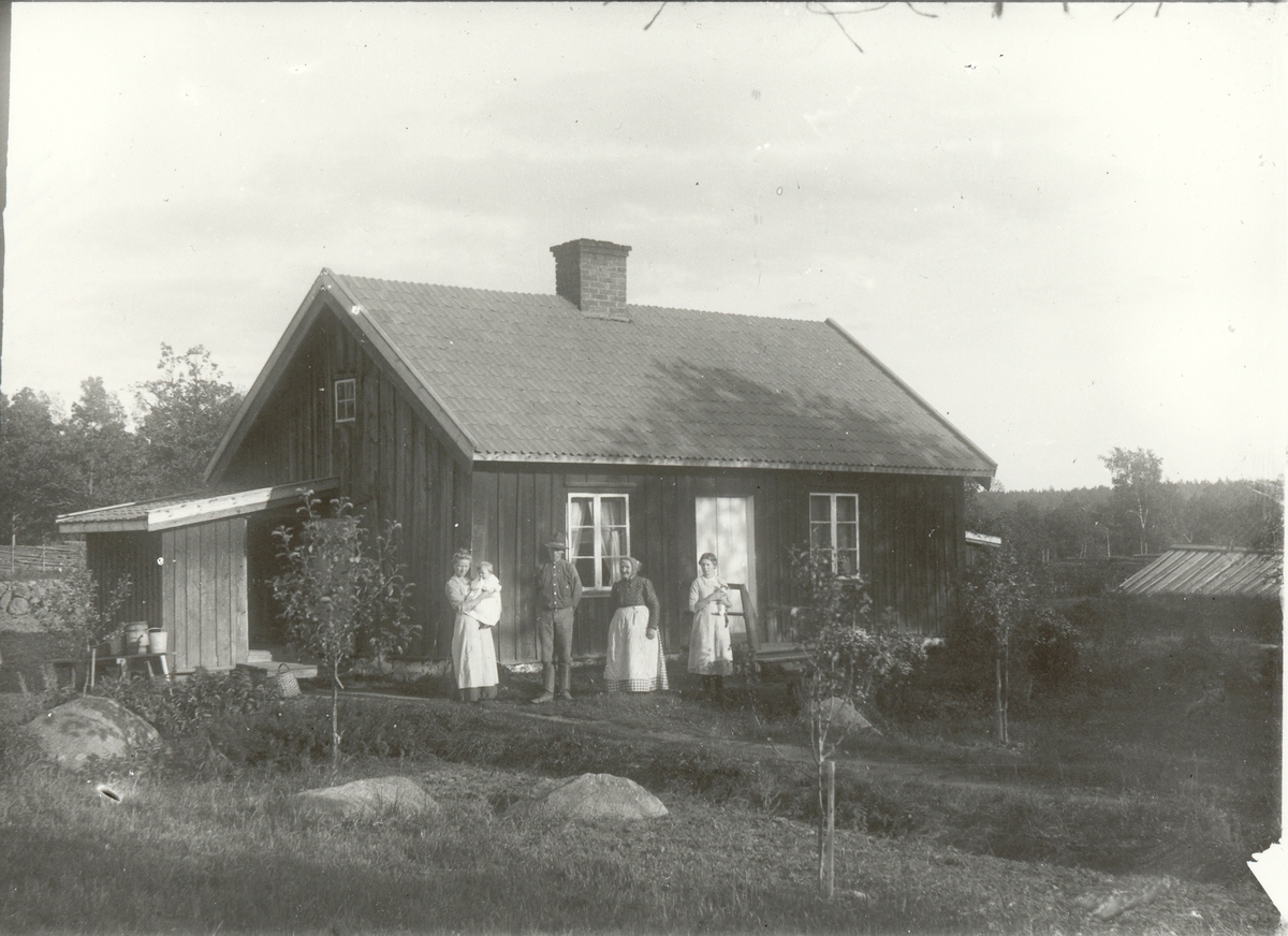 En familj utanför sitt hem i Åbo, Hjorteds socken 1913.