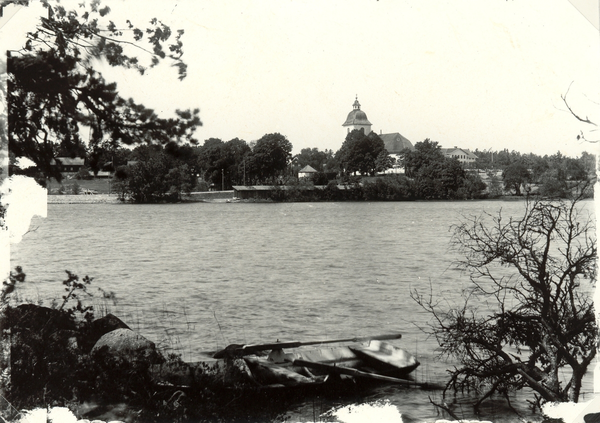 Hjorteds kyrka med sjön Hjorten i förgrunden.