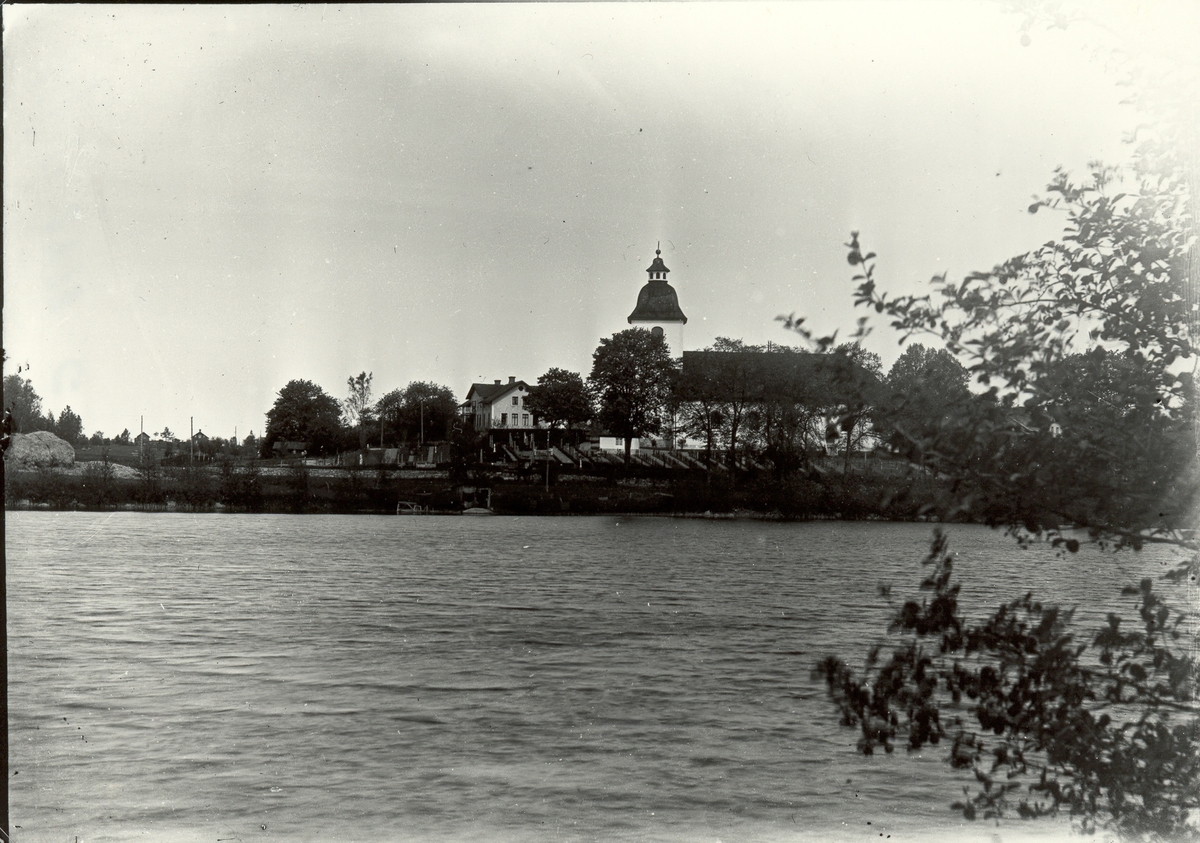 Hjorteds kyrka med sjön Hjorten i förgrunden.
