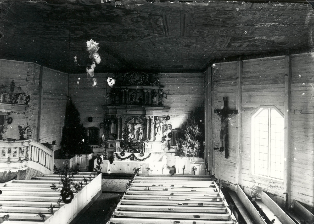 Interiör mot altaret och predikstolen Frödinge kyrka, uppförd i timmer 1744.