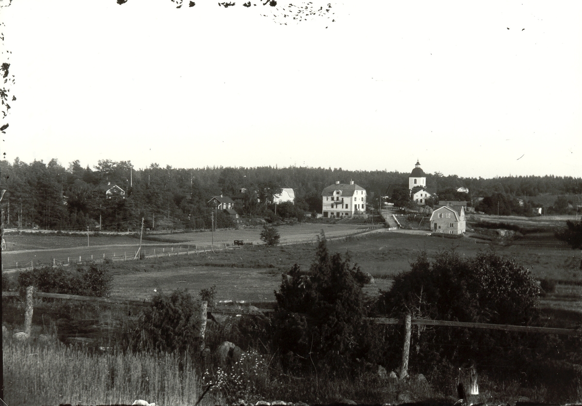 Vy från Hjorted med kyrkan i bakgrunden.