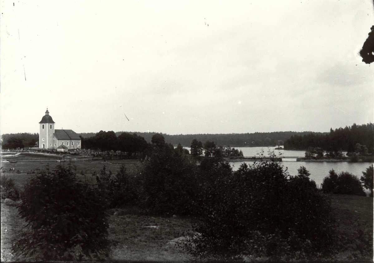 Vy från Hjorted med kyrkan och sjön Hjorten.