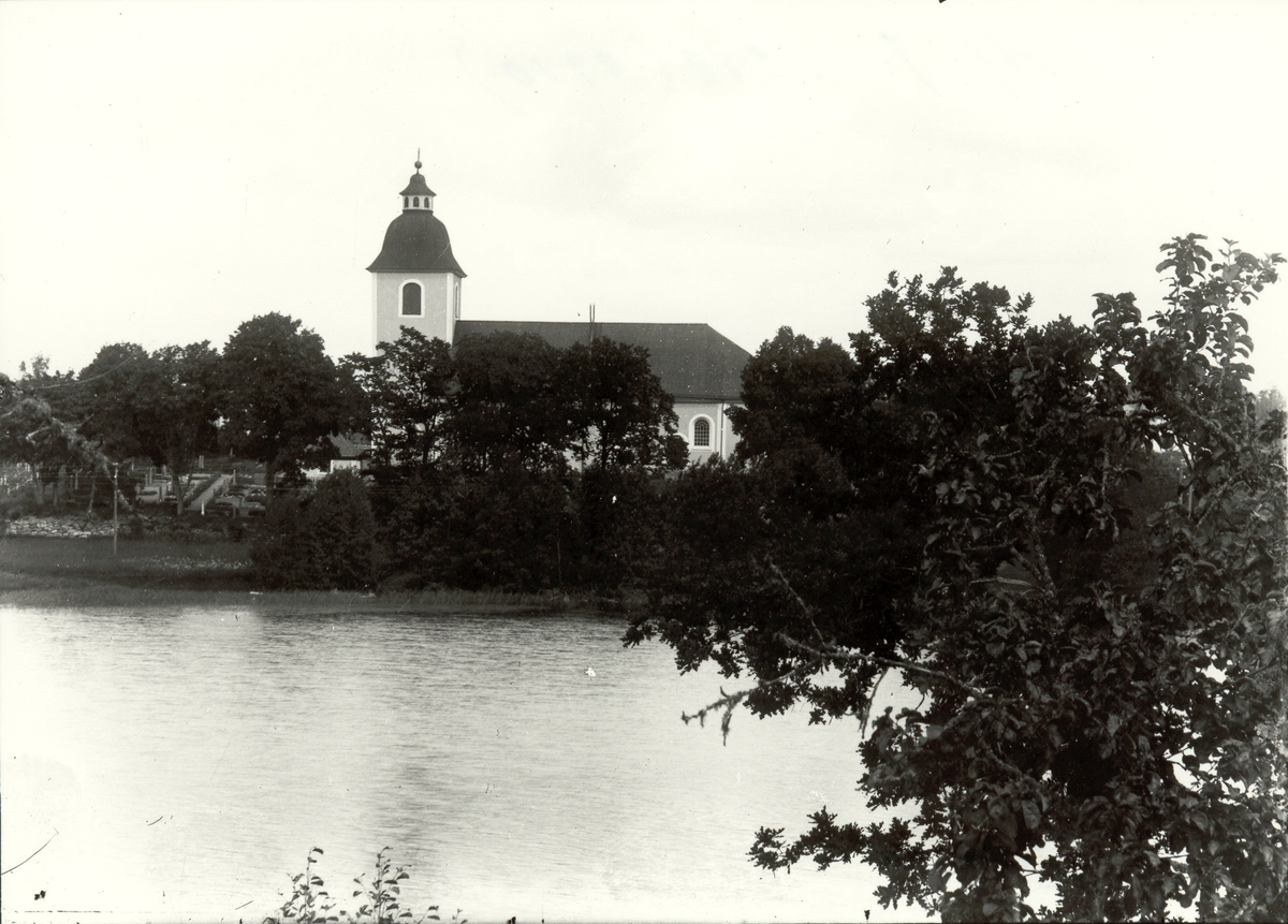 Vy från Hjorted med sjön Hjorten samt kyrkan i bakgrunden.