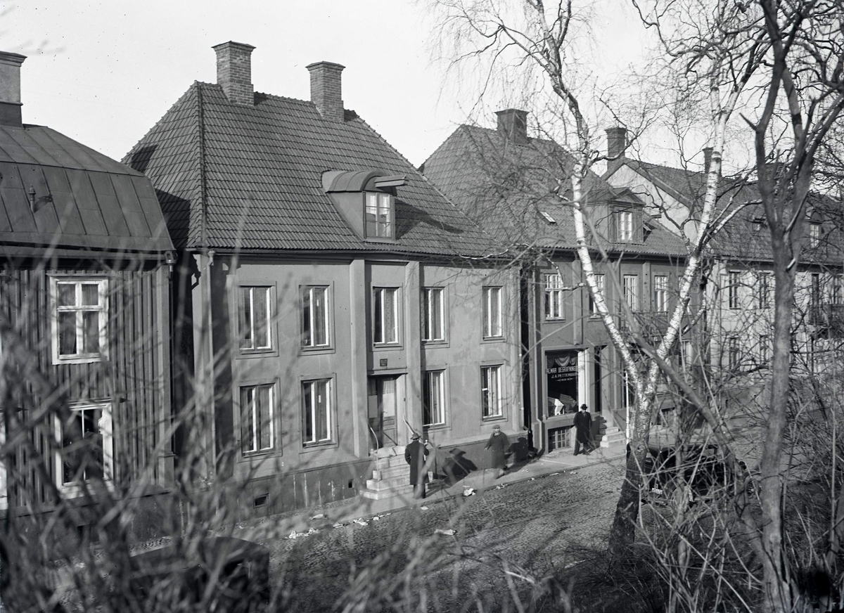 Ett bostadshus med två skorstenar och takkupa med hissbom. Det andra huset längre bort har skyltfönster och takkupa på Södra Vallgatan.