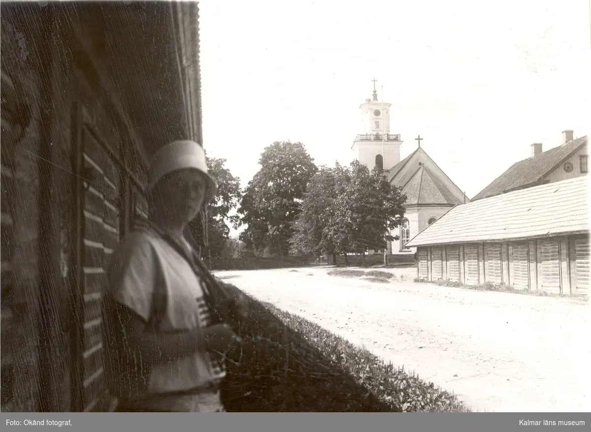 En kvinna vid ett kyrkstall som är ett hembygdsmuseum i Madesjö.
