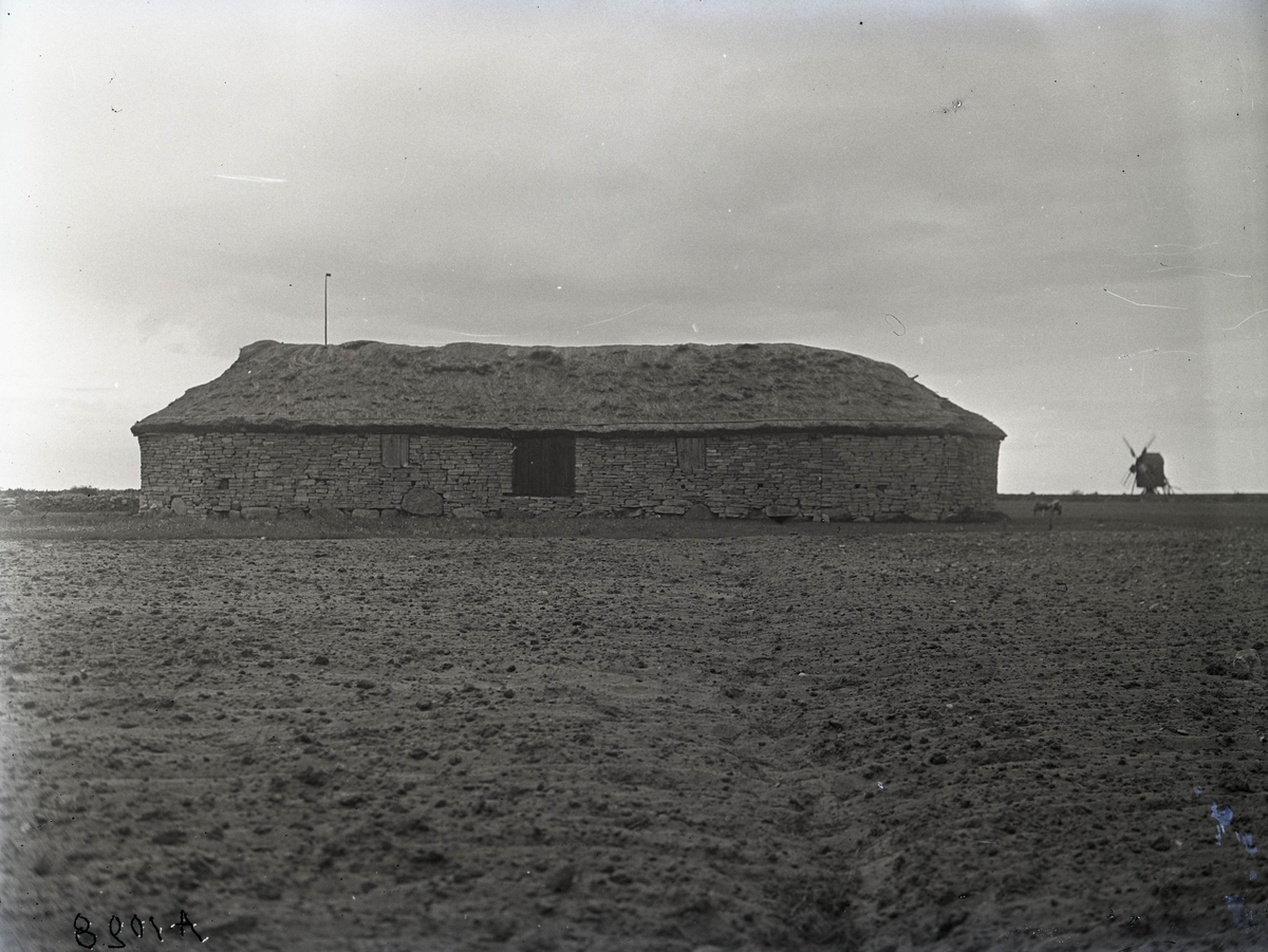 En stenlada med torvtak och en väderkvarn i Ebbegärde.
