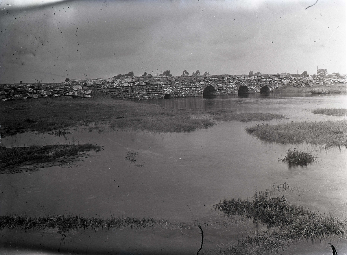 Översvämning vid en stenvalvsbro i Frösslunda.
