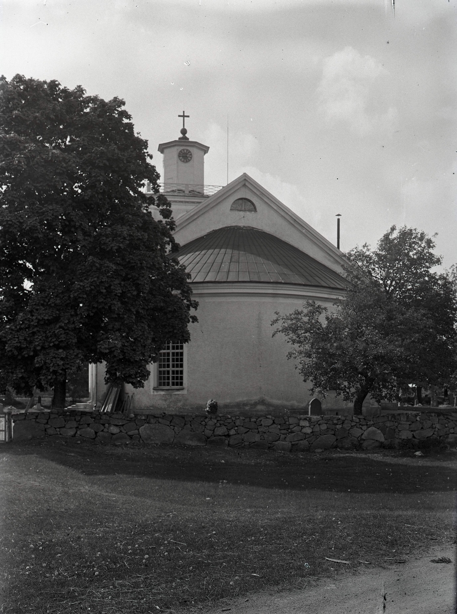 Bäckebo kyrka i nyklassicistisk stil. Exteriör gaveln och kyrkogårdsmuren.