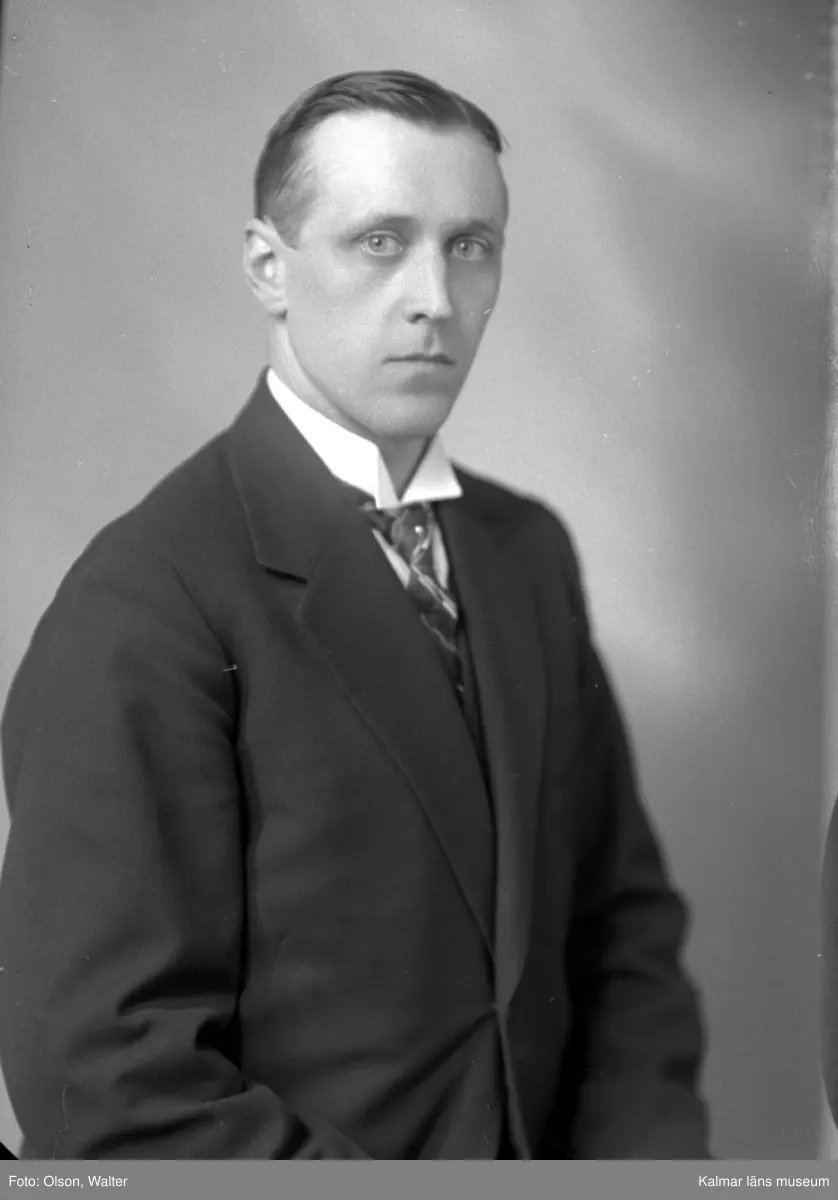 Ateljébild på en man iförd kavaj. Enligt Walter Olsons journal är bilden beställd av herr Gunnar Johansson.