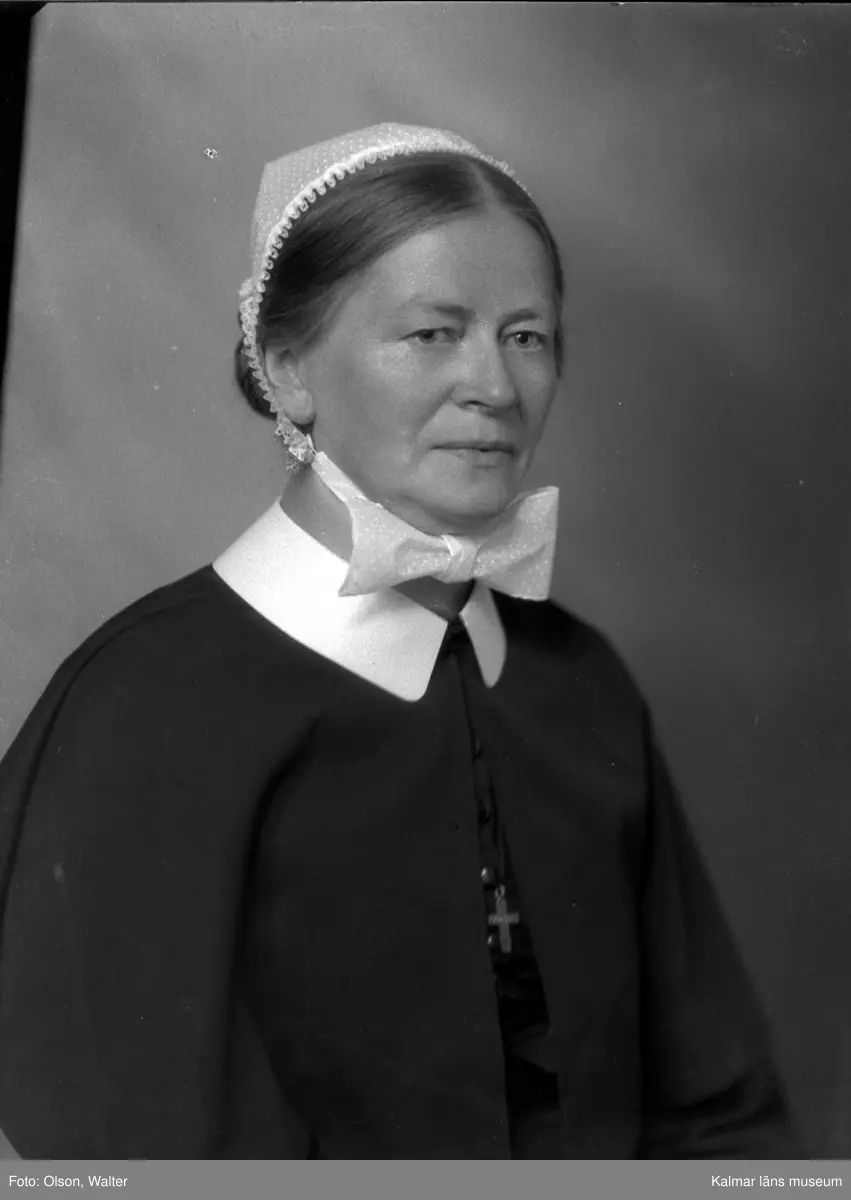 Ateljébild på en sjuksköterska i sjuksköterseuniform och hätta. Beställare till bilden: Syster Betty Holmstedt ifrån barnhemmet i Grebo.