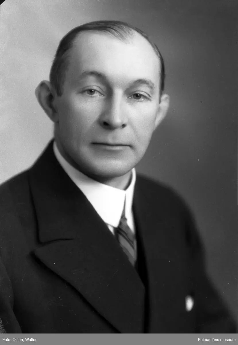 Ateljébild på en man i kostym. Beställare till bilden: J N Vörlund ifrån Frimurarehotellet i Kalmar.