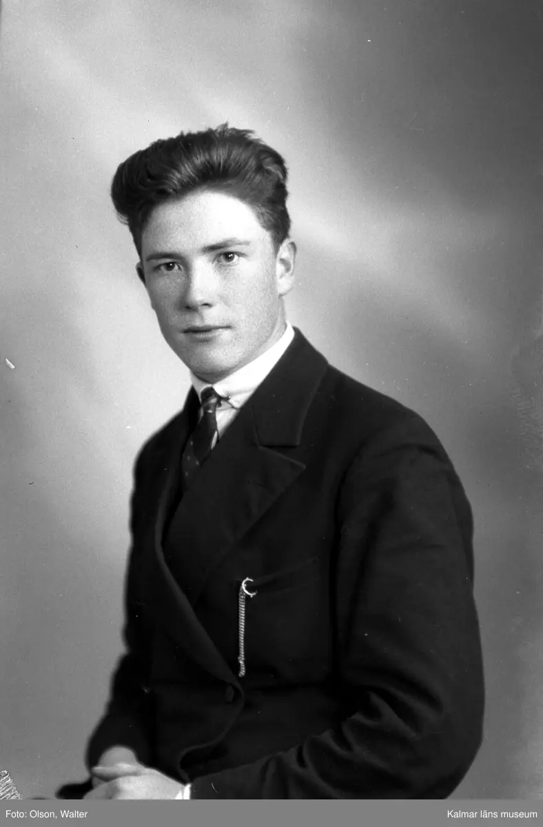 Ateljébild på en man i kostym och klockkedja. Beställare till bilden: Sigvard Davidsson ifrån Stadshotellet i Kalmar.