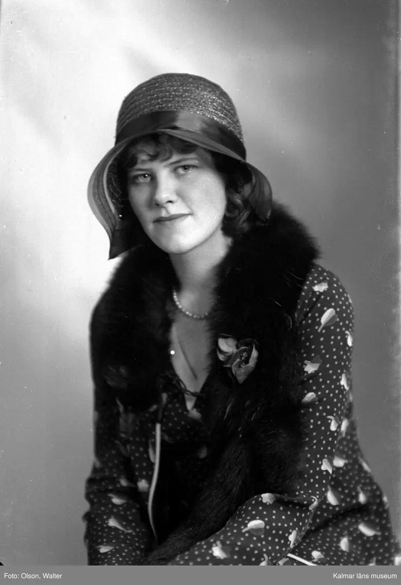 Ateljébild på en kvinna i stråhatt och klänning. Beställare till bilden: Birgit Söderberg ifrån Hotell Witt i Kalmar.