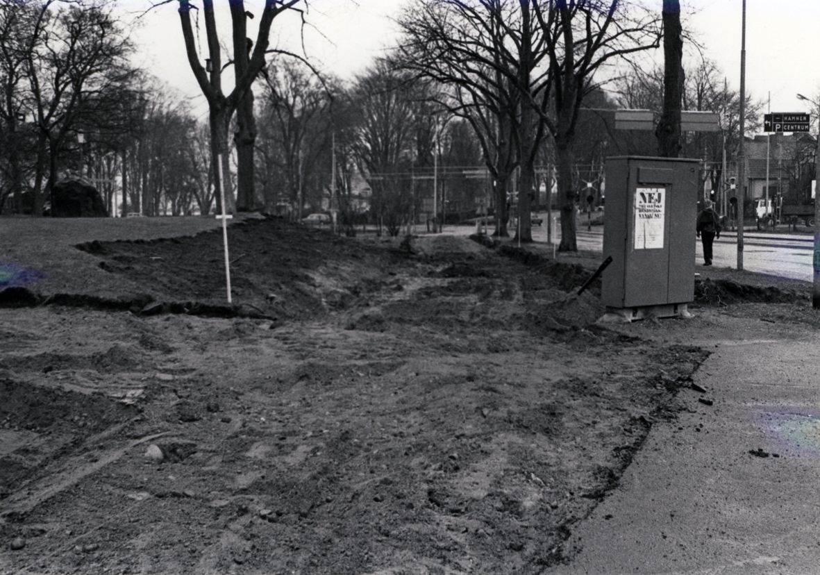 Vy från Tullslätten där renovering av cykelbana pågår, i bakgrunden järnvägsövergången och stadsparken.