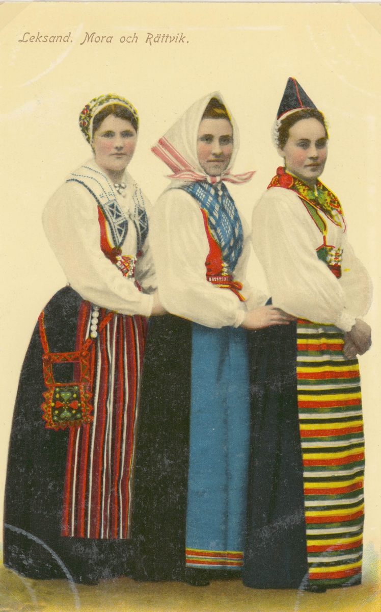 Tre kvinnor i folkdräkter från Leksand, Mora och Rättvik.