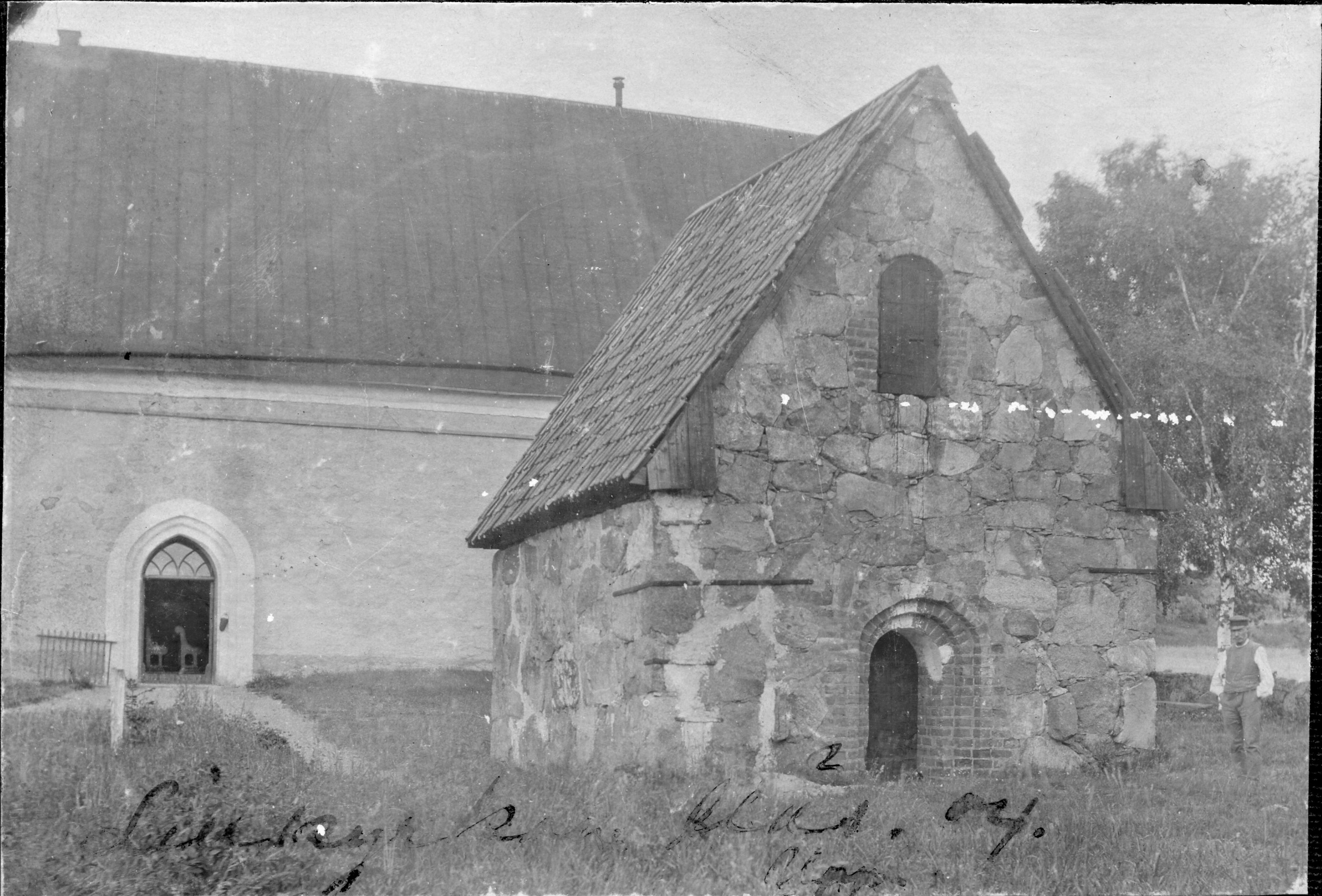 Kyrkan mot söder med fristående sakristia, 1200-talet, i förgrunden.