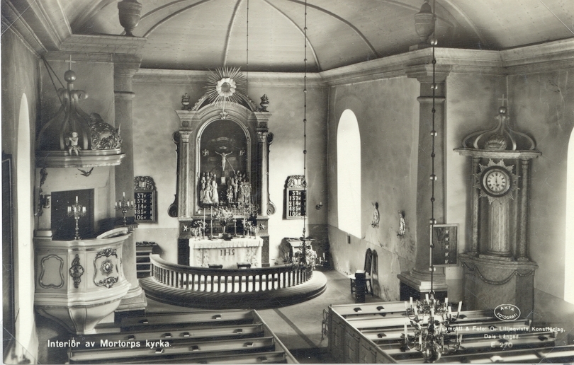 Interiör från Mortorps kyrka uppörd mellan 1100 och 1499 men mestadels medeltida stil interiört.