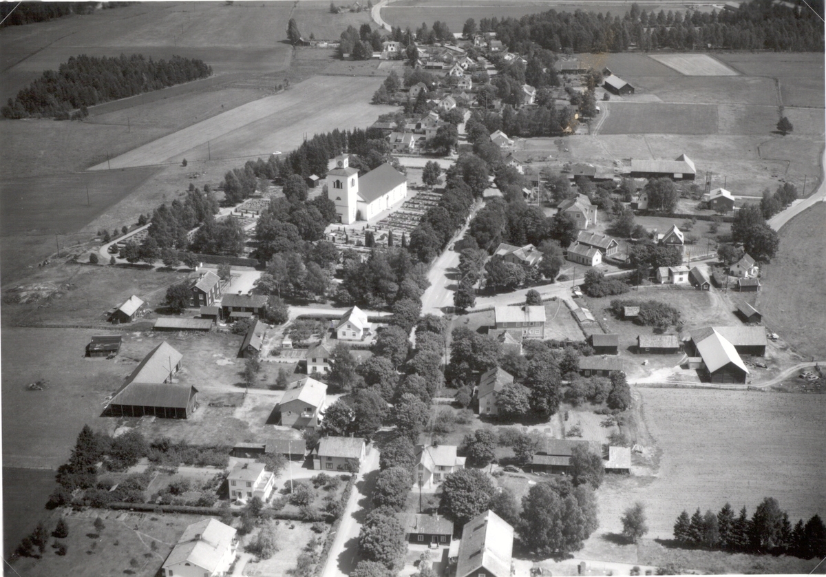 Flygbild över Målilla kyrkby.