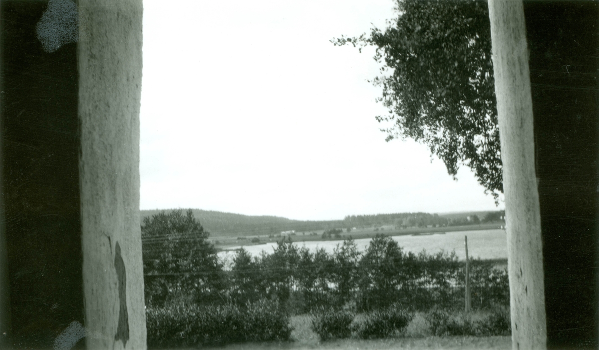 Utsikt från stora kyrkdörrarna över sjön, urfjällsängarna och Gränö höjd.