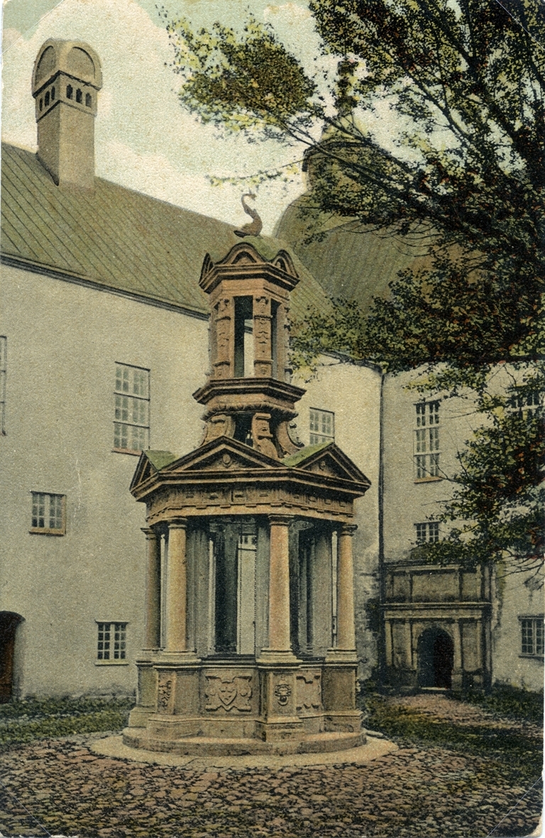 Vykort med motiv av slottsbrunnen på inre borggården på Kalmar slott.