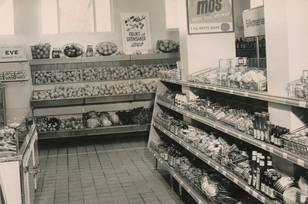 Interiör från Konsumbutiken på Tegelviksvägen. Första snabbköpsbutiken.
