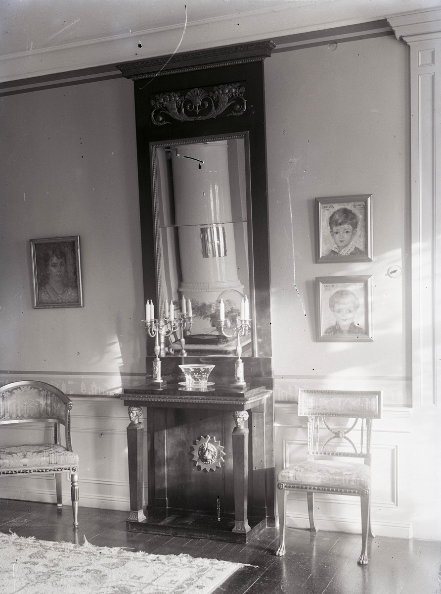En kakelugn i spegelbilden i Fågelfors Bruk.