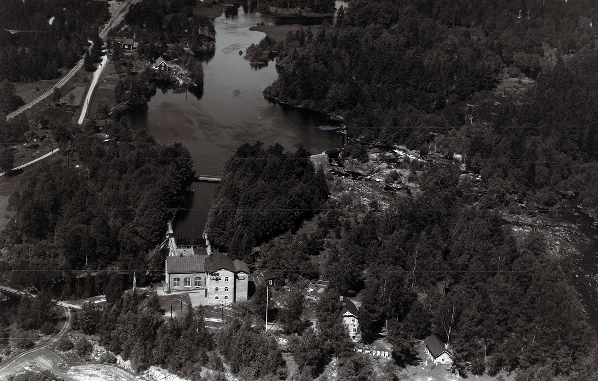 Flygfoto över Fliseryd. Finsjö kraftverk vid Emån.