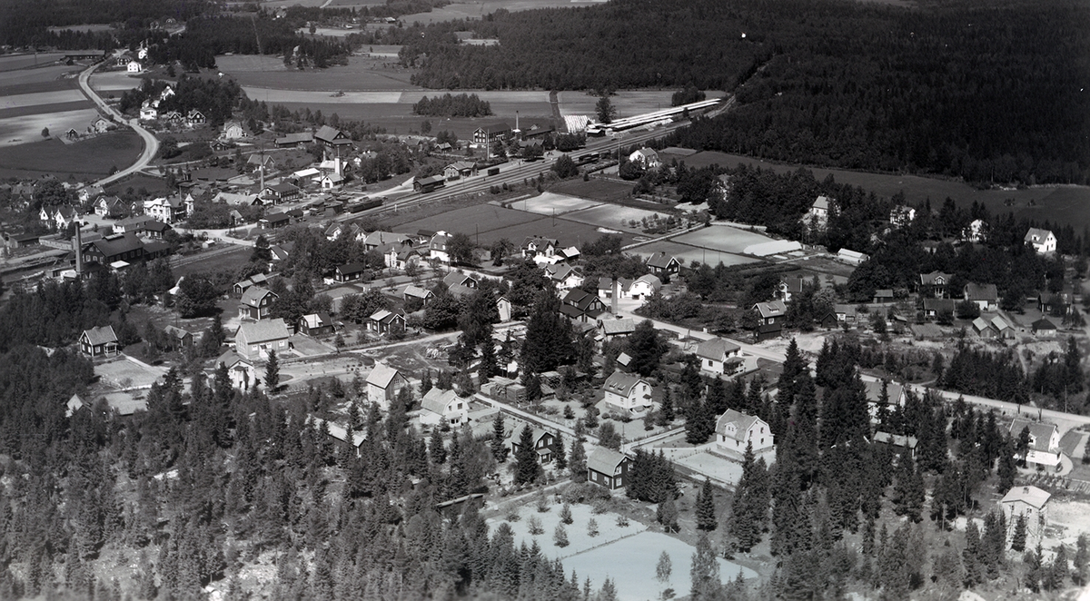 Flygfoto över Ruda med bostadshus, grusväg och järnväg.