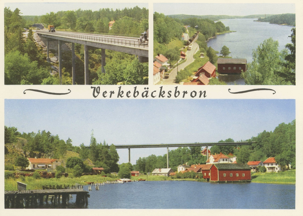 Vykort med Verkebäcksbron som byggdes av AB Armerad Betong, Kalmar, och invigdes den 5 december 1956 av landshövding Ruben Wagnsson. Den total brolängden är 174 meter, och höjden över vattenytan 30 meter.