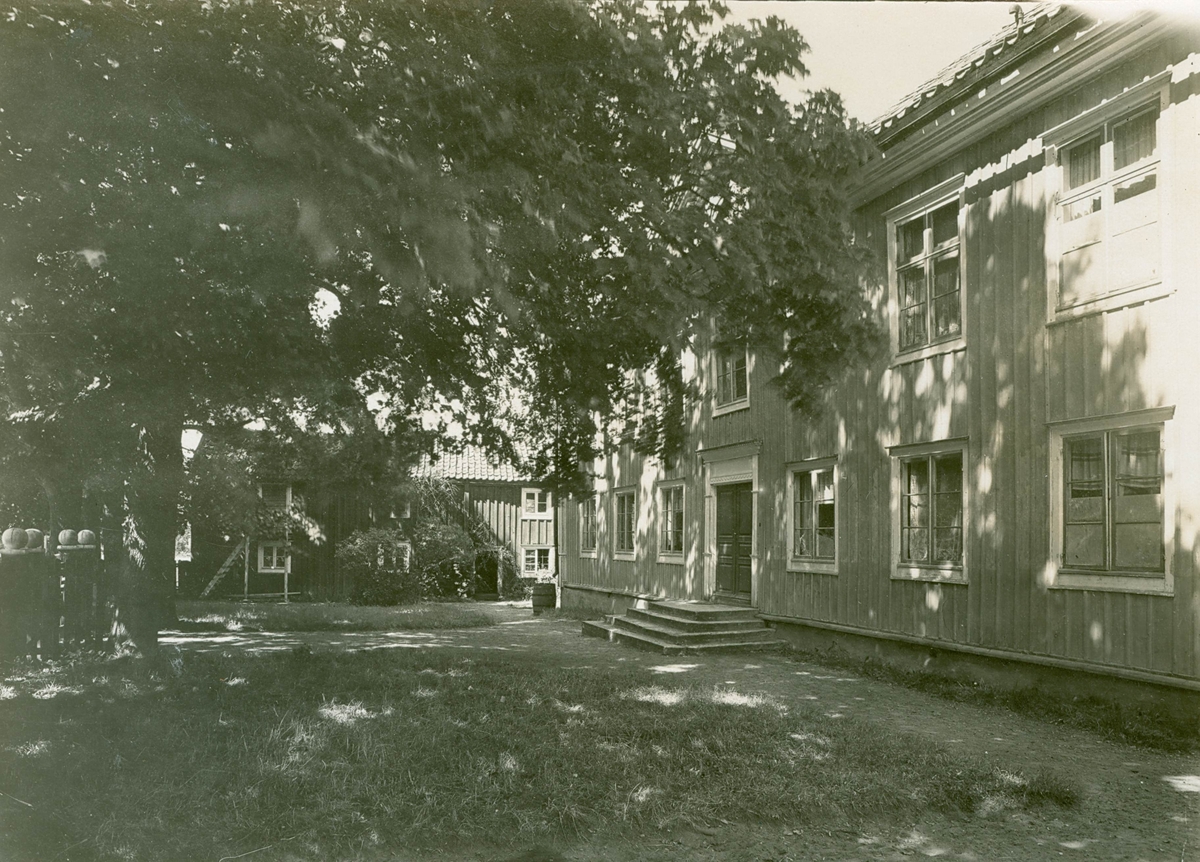 Gårdsplanen med flygeln rakt fram, till höger huvudbyggnaden.