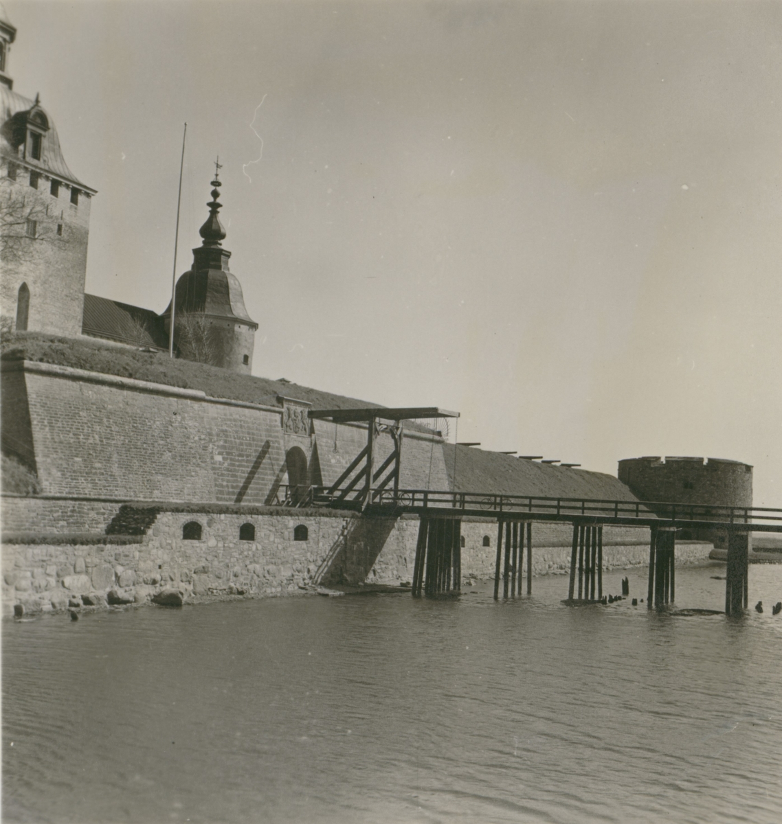Kalmar slott med vindbrygga, kanoner och vallgrav.