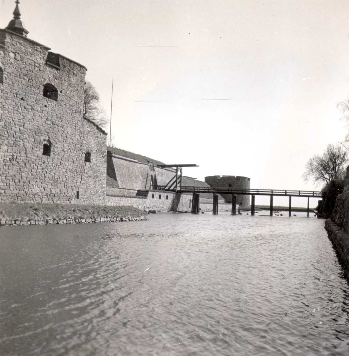 Kalmar slott med norra postejen, vindbrygga och vallgrav.