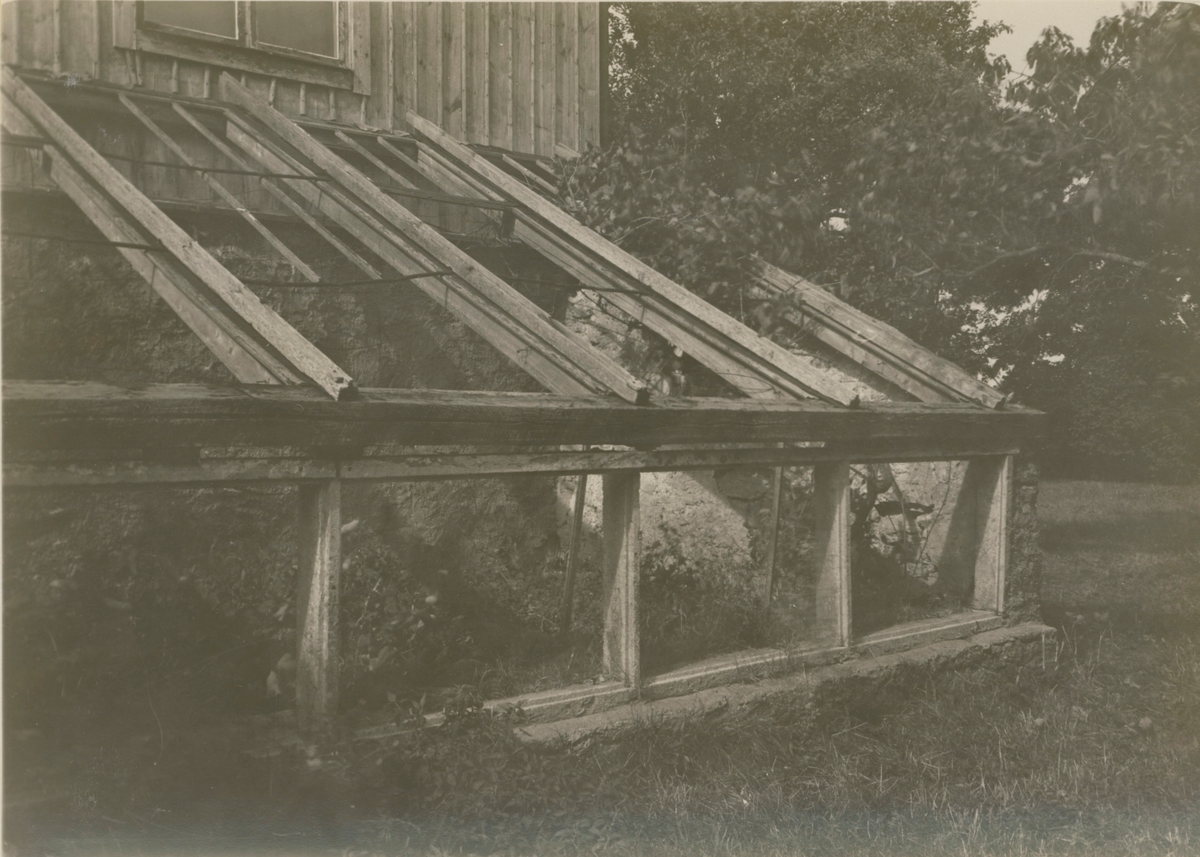Den gamla vinkasten vid gaveln. Det stående ramverket av kalksten.
