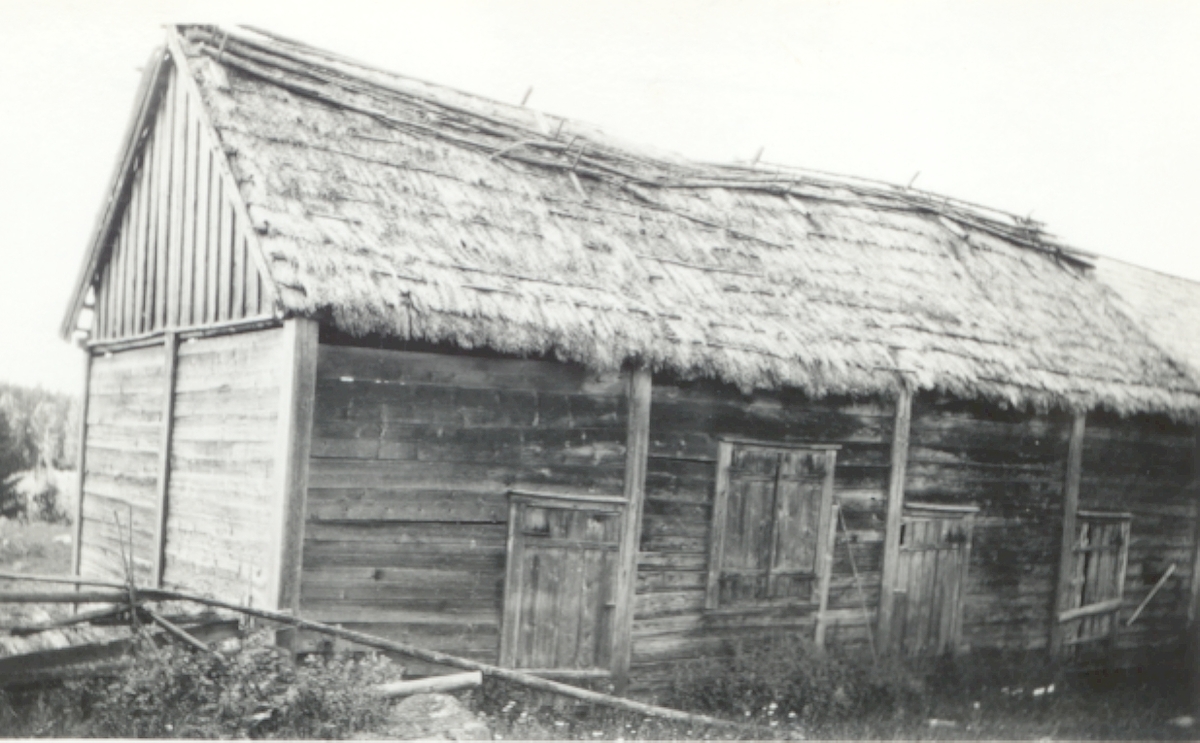 Ekonomibyggnad med stråtak i Posarp, Brändekulla.