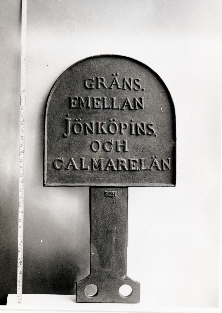 Tavla i gjutjärn, placerad mitt på bron för att angiva länsgränsen.