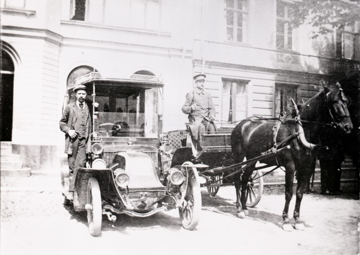 Tiderna förändras. Taxi bredvid hyrdroska utanför Teatern.