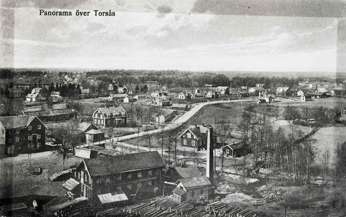 Panorama över Torsås, i förgrunden en träindustri.