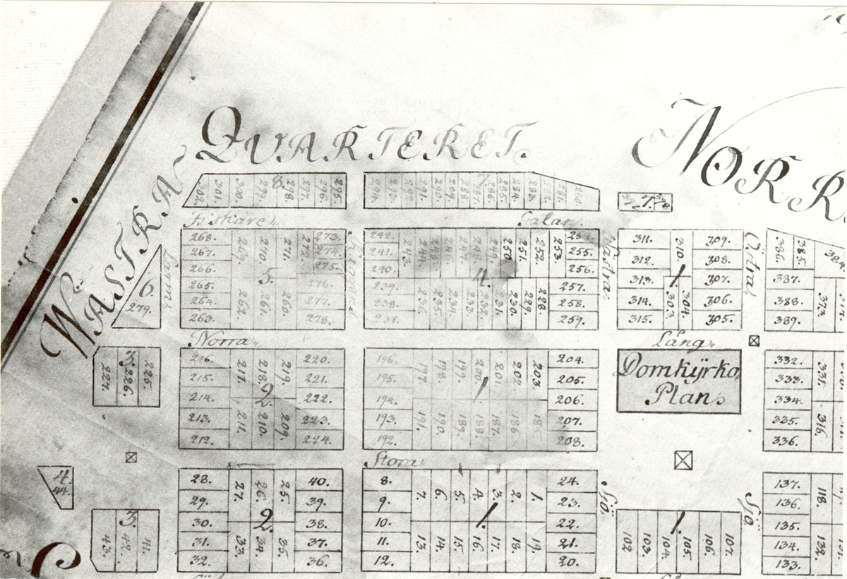 Detalj av karta i bläck och akvarell, kopierad av J. E. Engman 1804, i arkivet.